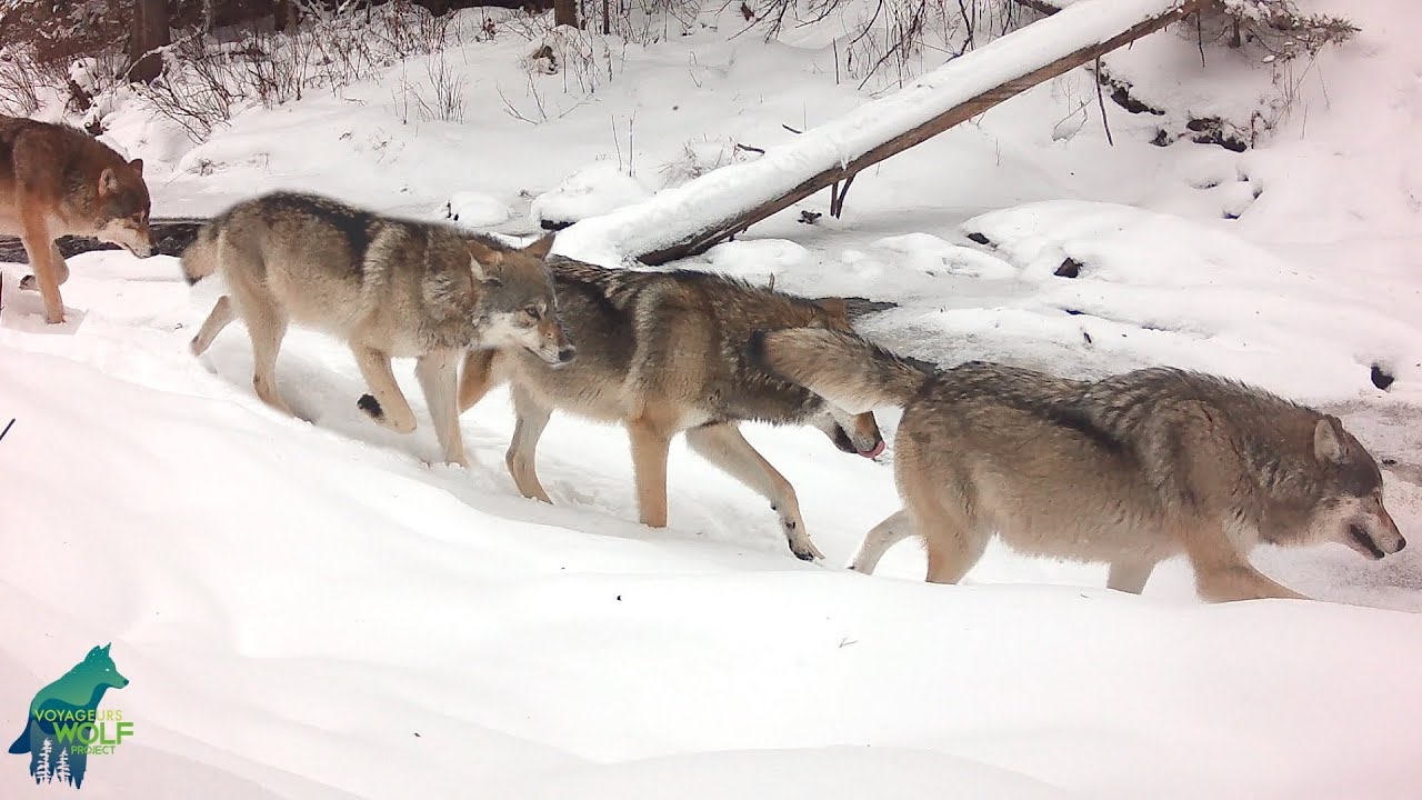 In the first video sequence, the first wolf to exit the frame is the breeding female, the second wolf to exit is the breeding male, and the last two are pups born in Spring 2023 that are now yearlings.