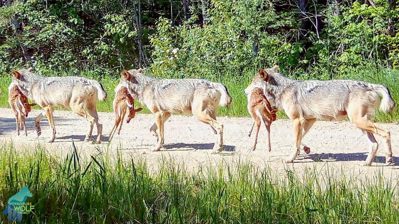 Once wolves kill fawns, as they do frequently at this time of year, they have a transportation issue: the pups are not big enough to travel to the kills so the adults must move the meal to the pups.